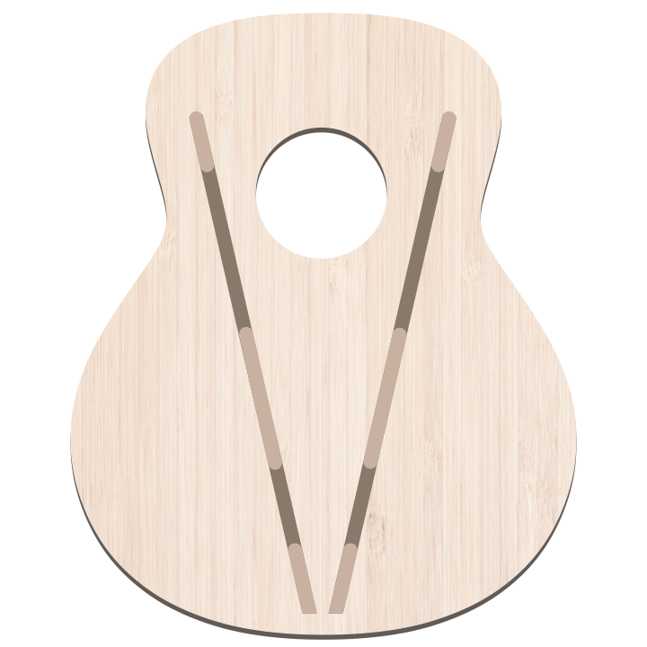 Fan bracing is a completely different bracing style used on our nylon-string models. It was inspired by patterns used by classical guitar builders. Because nylon strings generate less tension and energy, a nylon-string guitar typically has a thinner top and much lighter bracing. Fan bar styles come in different arrangements, and we use both five-bar and three-bar patterns. The three-bar pattern shown here (used for Academy, 100 and 200 Series nylon-string models) is a unique Taylor design that master builder Andy Powers adapted from his ukulele designs. It produces a signature Taylor nylon-string voice: clear, open, responsive to a light touch, and long on sustain.